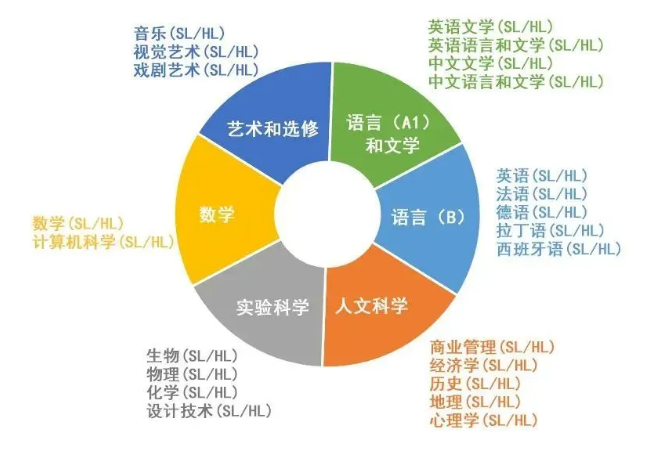 其中第1 - 5組為必修課,所以在這5組中的每一組中必須至少選擇一門學(xué)科;第六組為選修課,如果不想學(xué)習(xí)第六組的藝術(shù)課程,可以從科學(xué)、個(gè)人與社會(huì)或語言(B)中再選擇一門課程。