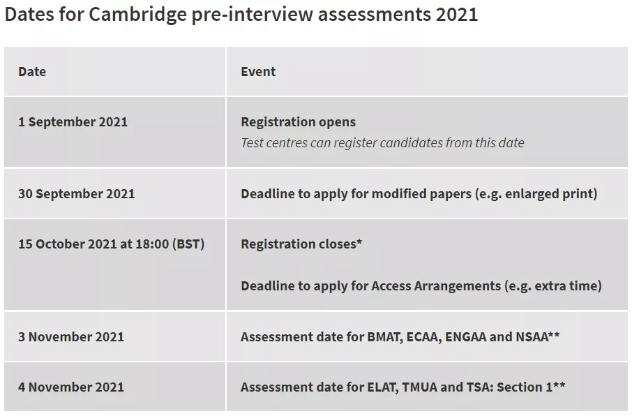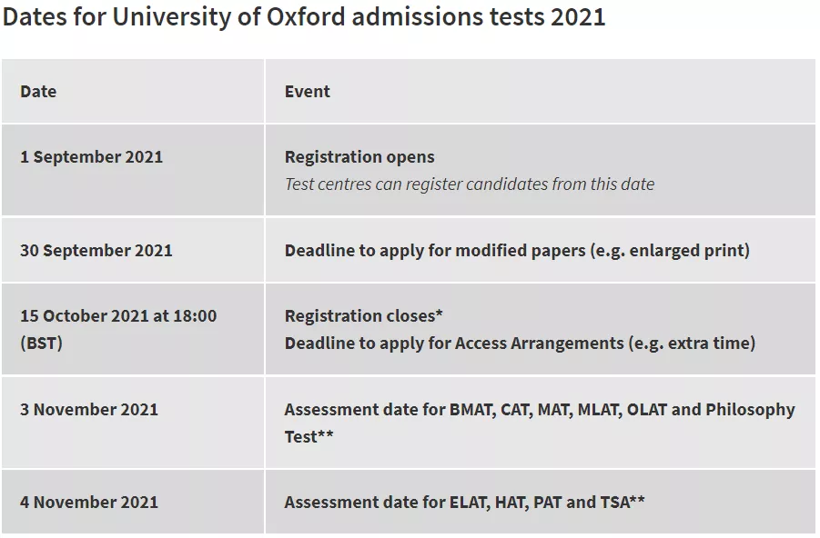 申請牛津大學和劍橋大學本科2022入學,入學考試報名開始時間2021年9月1日,截止時間2021年10月15日 18:00 (BST)。