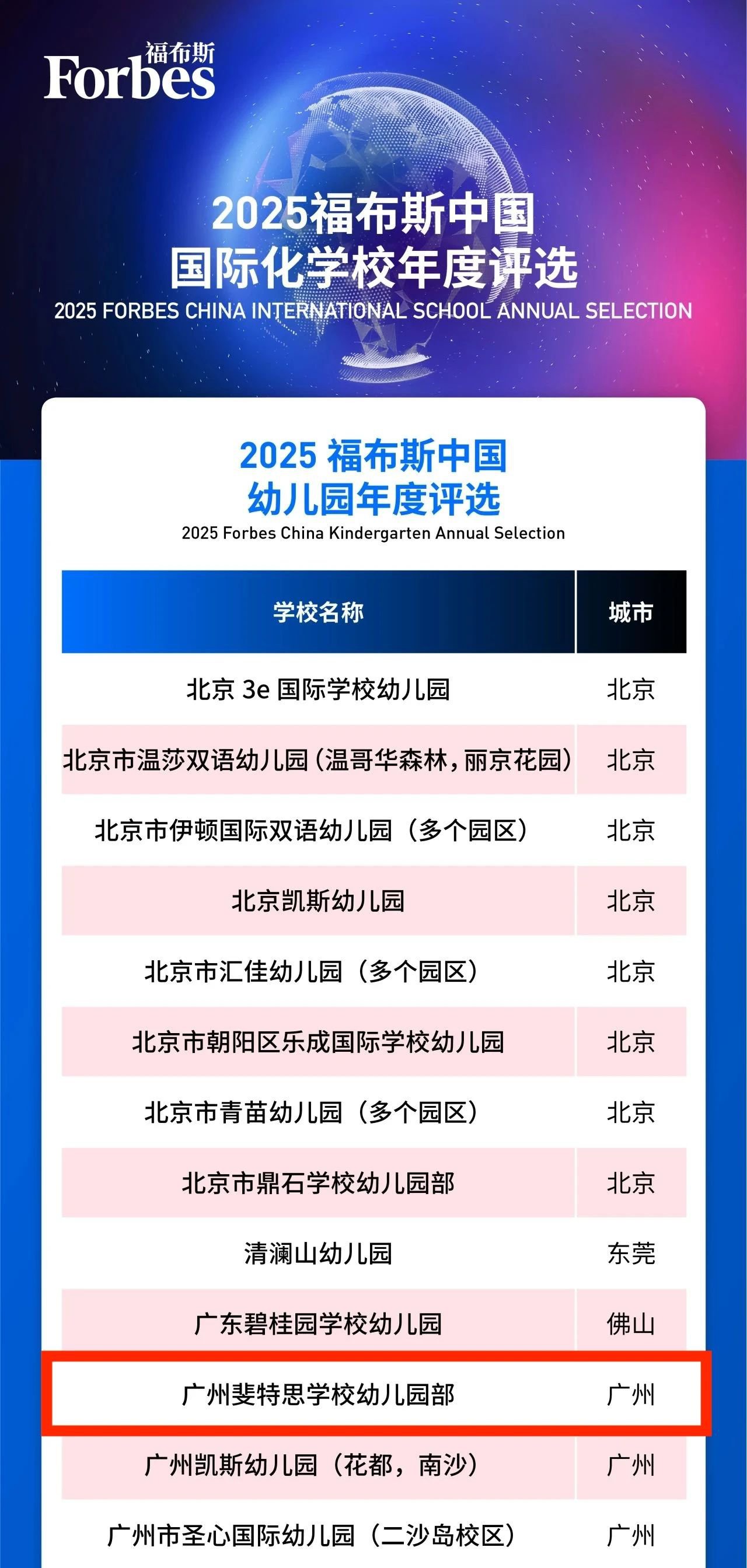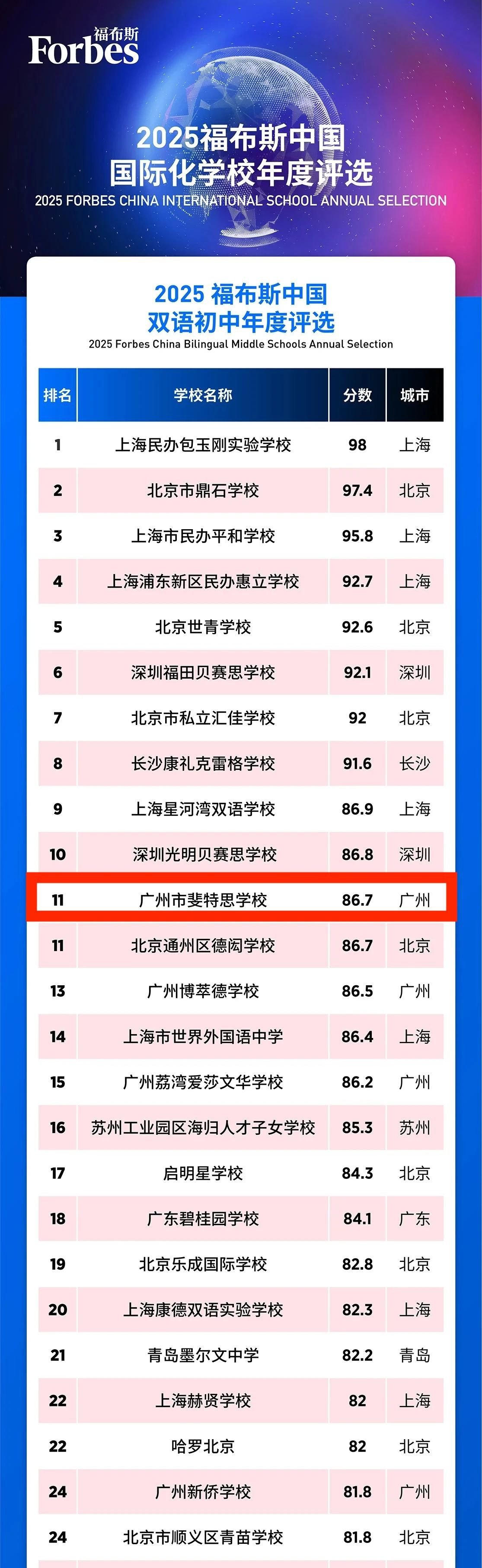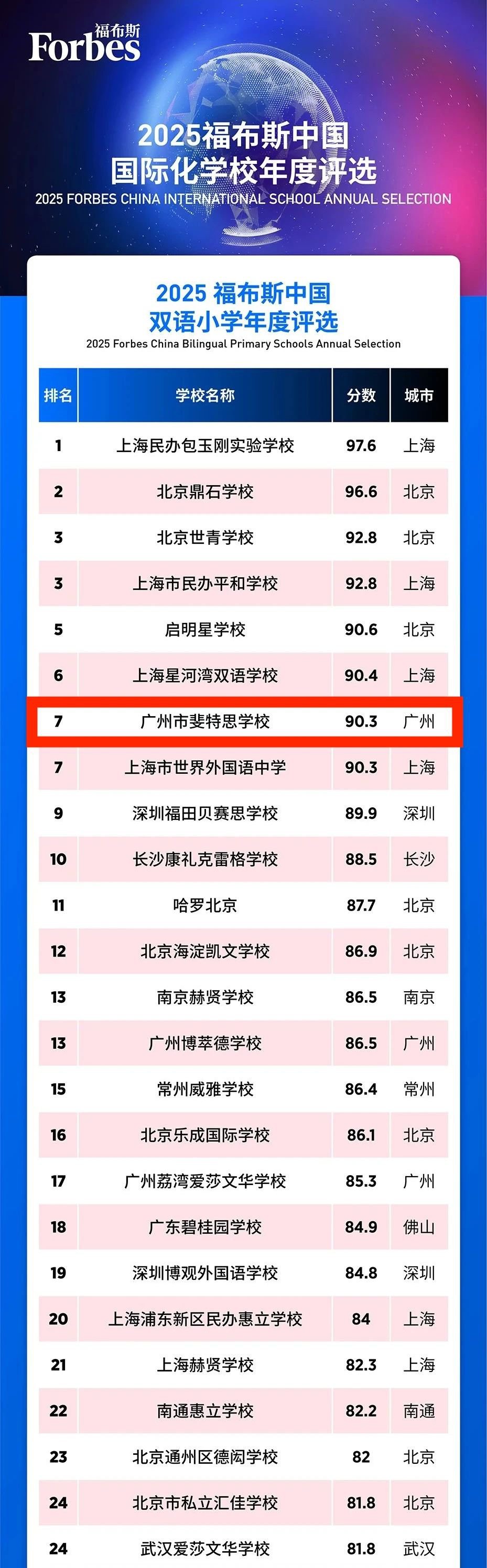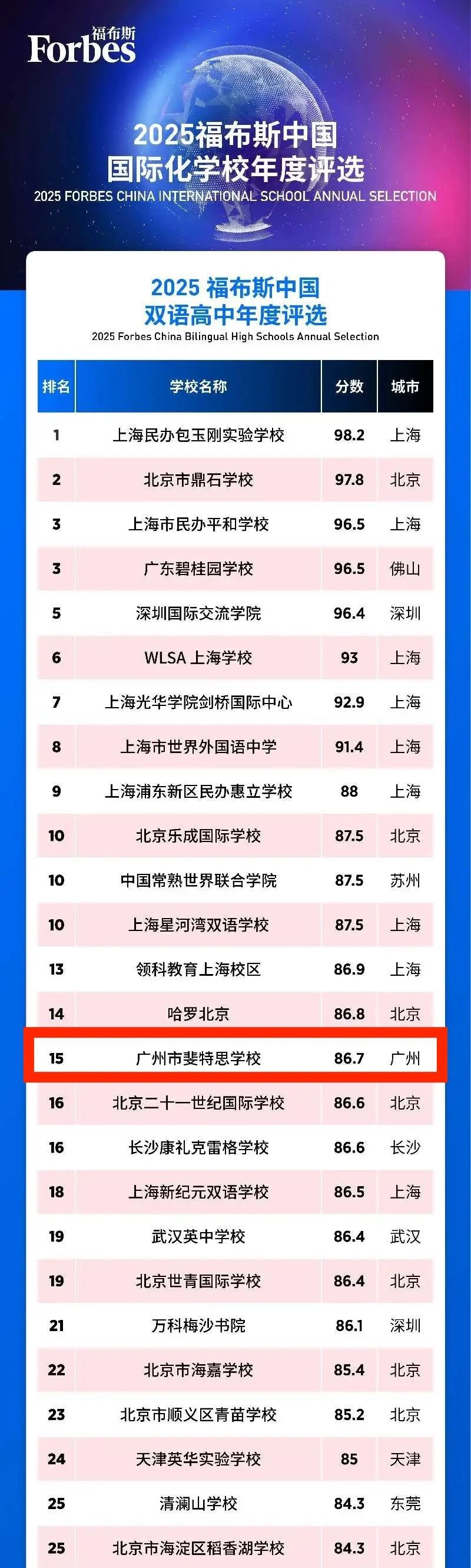 2025年6月10日,2025福布斯中國國際化學校評選結果正式發布。評選核心圍繞五大維度——學術成就、教學質量、基本信息、國際認證、創新與多維發展,通過40個量化指標,對全國3000余學校學部進行綜合評估。