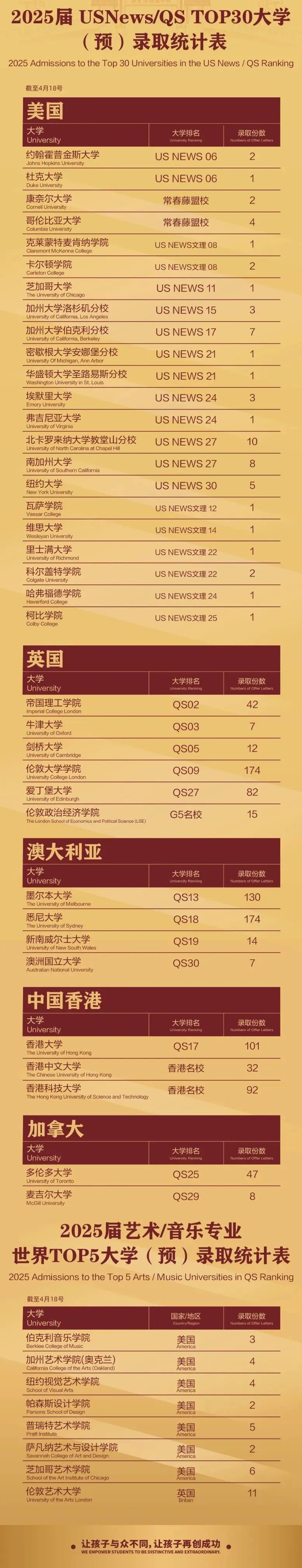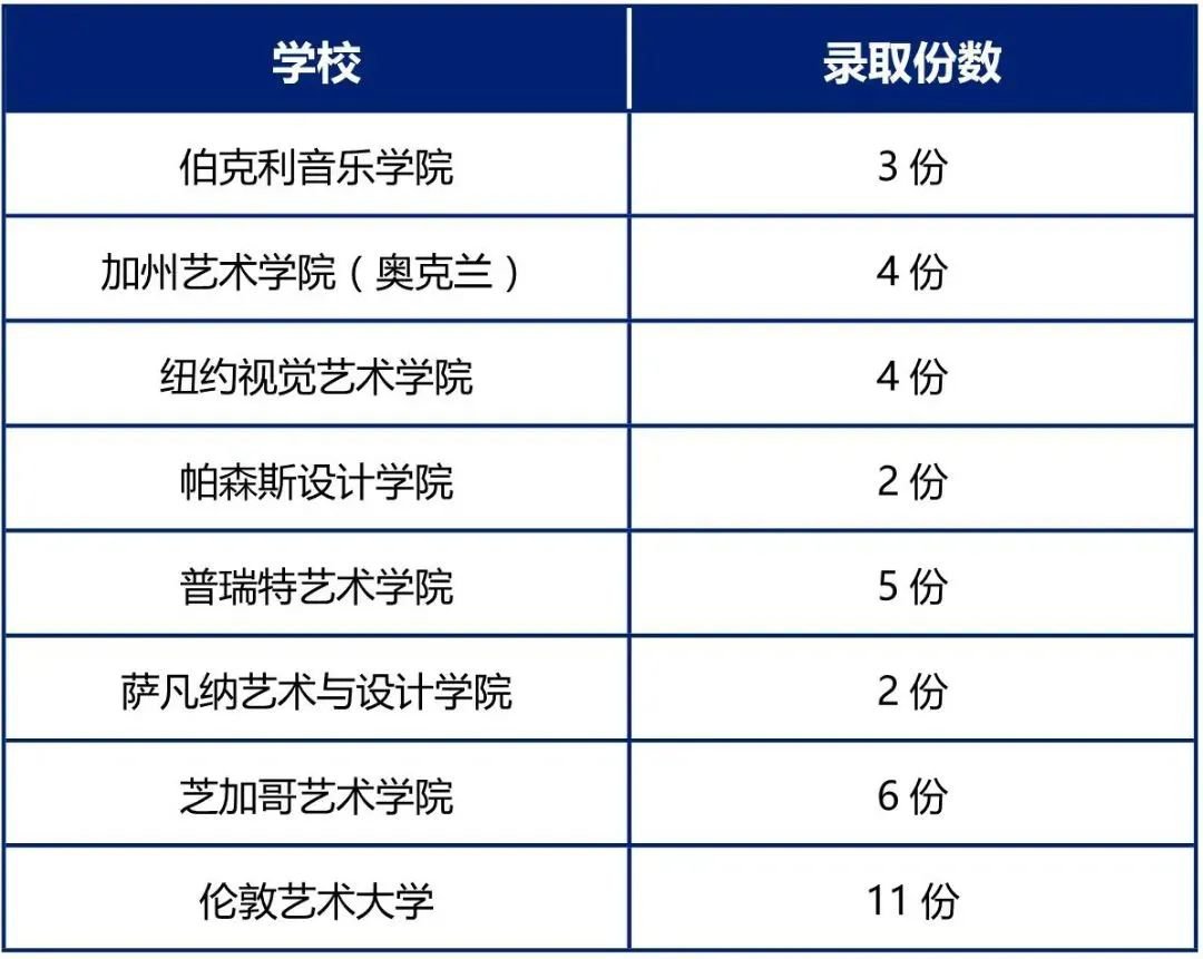 853份錄取信來自QS全球前30、USNews全美前30及藝術/音樂領域世界前5的頂尖學府,覆蓋320名畢業生,優質錄取占比達91%。