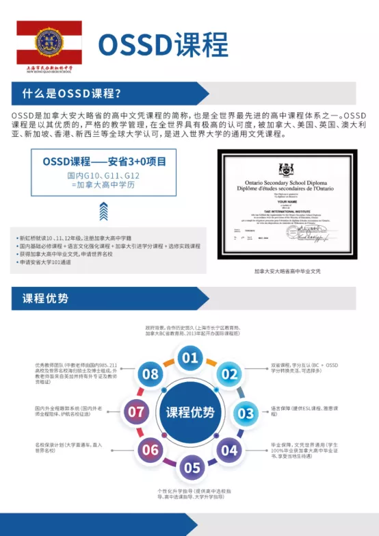 上海市新虹橋中學嚴格按照加拿大雙省(BC省和安省)課程要求,引進加拿大的教學方法和原版教材,并由教育部認證的加拿大持證教師全英文授課,畢業后獲得加拿大教育部頒發的高中畢業文憑,成績被美國、加拿大、英國、澳洲、新加坡等國家以及中國港澳各個大學所認可,享受本土學生待遇,以加拿大本土學生身份申請海外大學。