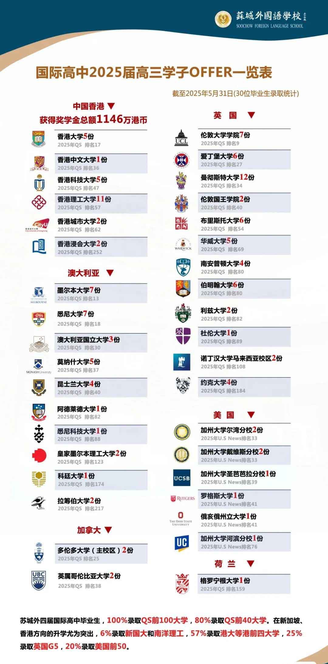 四年來,學校國際高中厚積薄發、穩扎穩打,不斷踐行IB終身學習者的培養使命,秉持“量身定制”的教育教學體系和升學規劃體系,將一批批優秀學子送往全球各地的知名學府——四屆國際高中畢業生100%錄取QS前100大學,80%錄取QS前40大學,25%錄取英國G5,20%錄取美國前50;在新加坡香港方向的升學尤為突出,6%錄取新國大和南洋理工,57%錄取港大等港前四大學,2025年錄取獲得獎學金1146萬港幣。