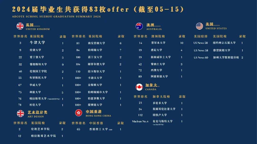 • 截止到目前,蘇州阿德科特2024屆畢業生已經收獲了75枚offer,申請地區、國家包含中國香港、英國、美國、澳洲、加拿大;專業包含理工、心理、商科、計算機、人文、社會全面開花。