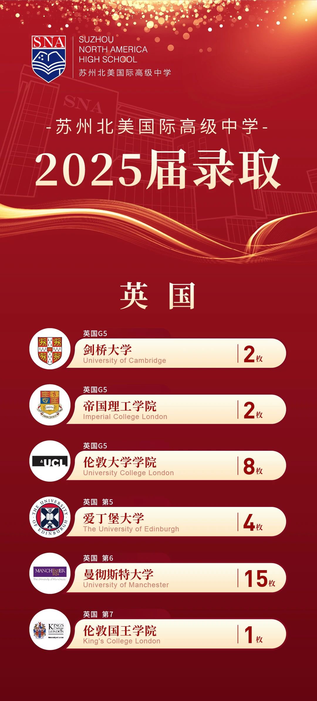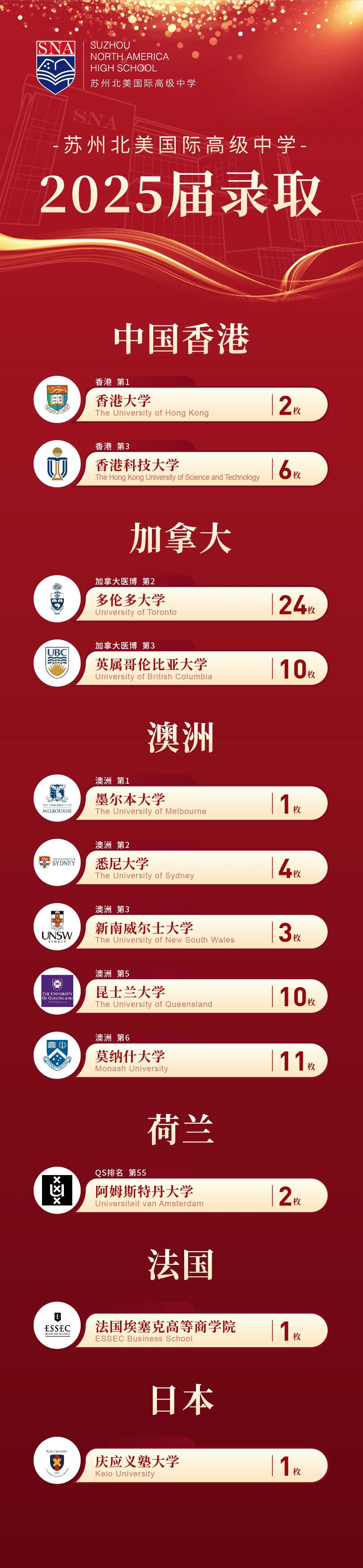 截至2025年3月14日,蘇州北美國際高級中學國際部135名高三學子憑借卓越的學術實力與綜合素養,斬獲全球400余封頂尖大學錄取,覆蓋美國、英國、加拿大、中國香港、荷蘭、法國、日本等國家和地區。