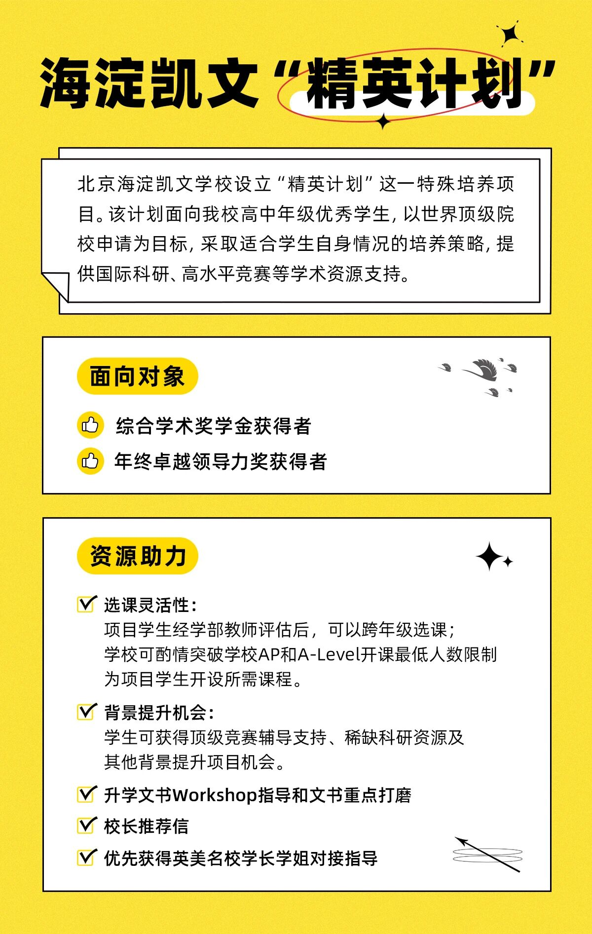 海淀凱文設立“精英計劃”這一培養項目,面向校內高中年級優秀學生,以世界頂級院校申請為目標,根據學生所在年級特點,采取漸進的、適合年級特點的特殊培養政策,提供國際科研及高水平競賽等學術資源支持。