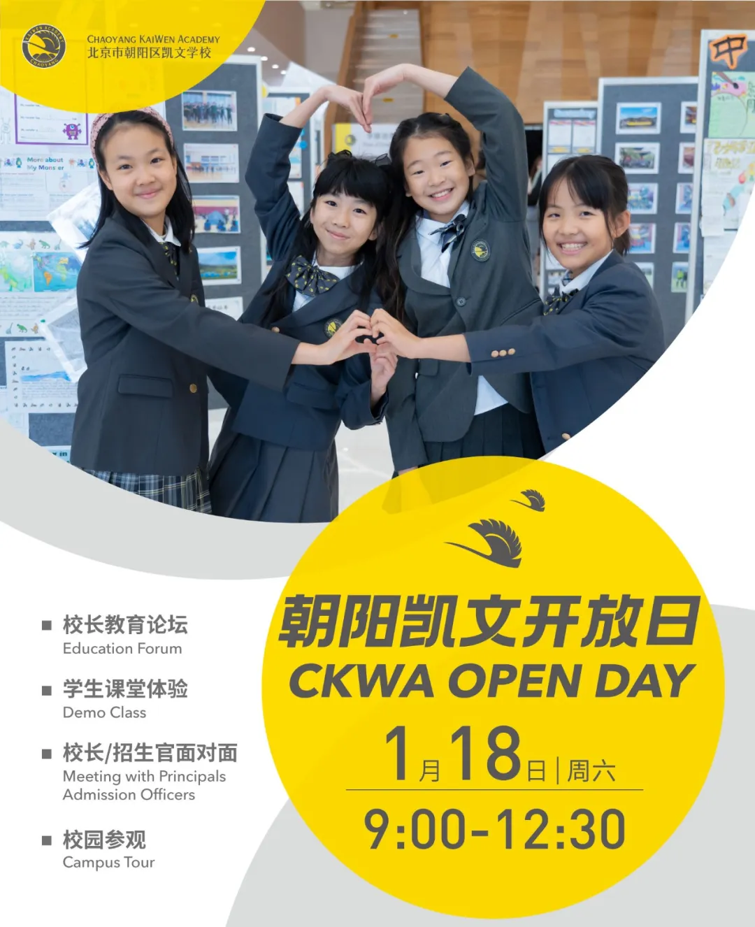 歡迎您預約1月18日9:00朝陽凱文“校園開放日”了解課程設置、深度體驗朝陽凱文藝術、體育、科創多元化發展的全人教育,感知好教育的樣子。