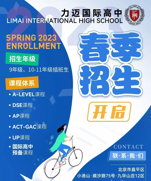 北京力邁國際高中雙語預科課程,是針對學生從公立初中過渡到國際高中而設(shè)立的課程,主要招收G9(初三)的學生;可以助力學生無縫對接國際高中課程,全面提升英語聽說讀寫能力、英語文學素養(yǎng)和理科思維,提前適應國外GPA評分體系,培養(yǎng)優(yōu)秀的學習習慣,最終敲開海外名校的大門。課程學習結(jié)束后,學生可以根據(jù)自己的興趣愛好和留學方向,選擇入讀力邁國際高中的其他國際課程體系,諸如A-Level 、AP、ACT-GAC、UP、DSE香港課程等。在這里,我們教授的不僅僅是知識與技能,更多的是給學生們提供一次探索自己、提升自己和培養(yǎng)良好學習習慣的機會。
