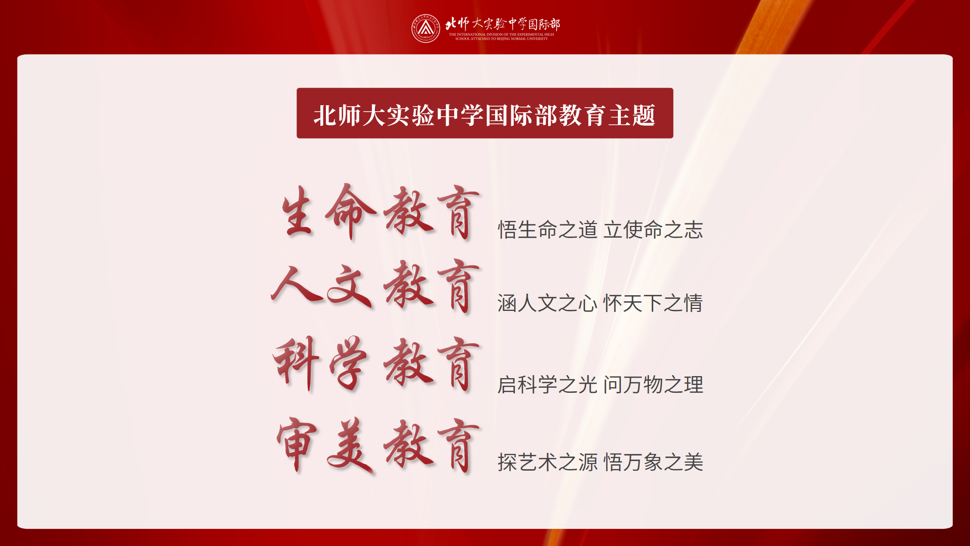 國際部秉持生命教育、人文教育、科學教育和審美教育四大主題。生命教育讓學生悟生命之道,立使命之志;人文教育涵人文之心,懷天下之情;科學教育行探索之道,拓創新之境;審美教育探藝術之源,悟萬象之美。