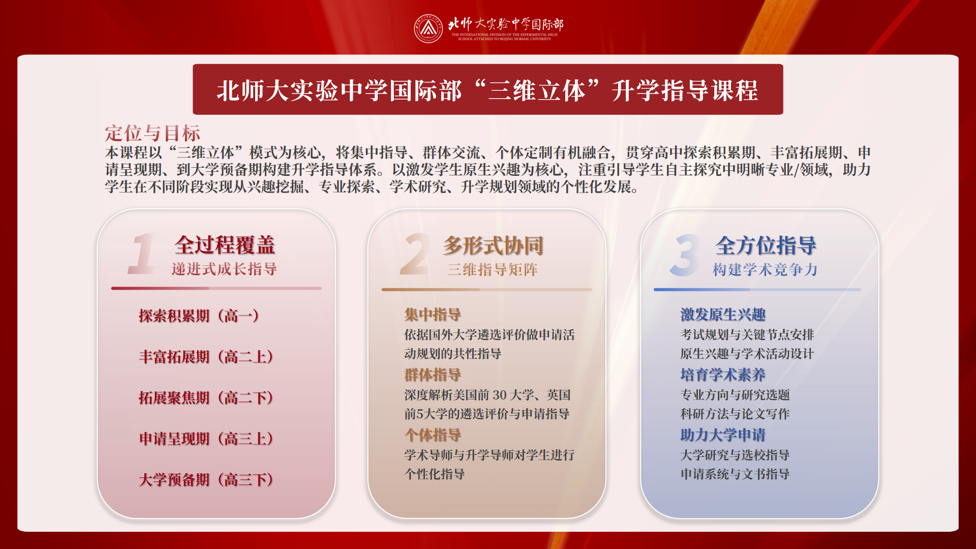 國際部的“三維立體”升學指導課程貫穿高中全階段,包括探索積累期、豐富拓展期、拓展聚焦期、申請呈現期和大學預備期。通過集中指導、群體指導和個體指導相結合的方式,全方位指導學生激發原生興趣、培育學術素養、助力大學申請。