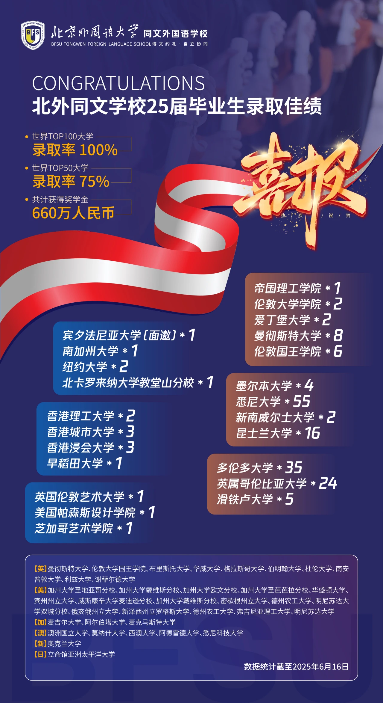 學(xué)校結(jié)合學(xué)生的實(shí)際情況制定多國(guó)聯(lián)申的規(guī)劃方案,積極探索國(guó)內(nèi)、國(guó)外雙軌制升學(xué)路徑,為學(xué)生提供更多樣性、多元化的升學(xué)指導(dǎo),讓更多的學(xué)子通過學(xué)校的規(guī)劃和培養(yǎng)走向更寬廣的世界舞臺(tái)。歷屆畢業(yè)生足跡遍布美、澳、歐、亞四大洲及港澳臺(tái)地區(qū)的世界一流學(xué)府。