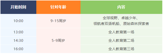 上午場的開放日活動將帶來全球視野寄宿暑期活動、卓越少年夏校、領航者雙語帆船暑期活動和原始森林探索者的詳細介紹。