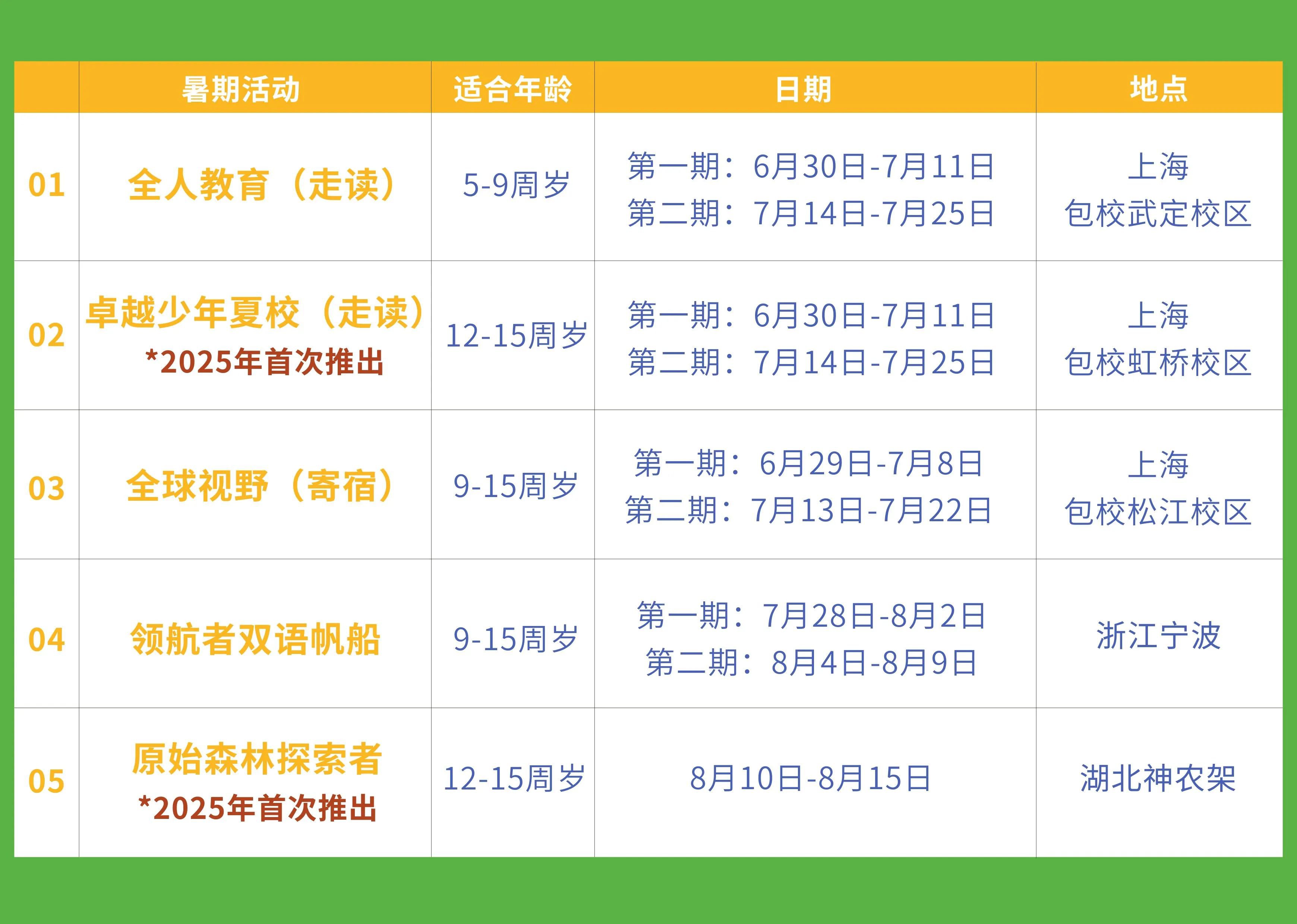 開放日當天,您和孩子能夠詳細了解每項暑期活動的具體安排,體驗其中的熱門主題課程,更有當天專屬的現場折扣及神秘禮物!2025暑期活動面向5-15周歲的學生開設全人教育走讀、全球視野寄宿、卓越少年夏校以及在寧波進行的領航者雙語帆船活動和在神農架開展的原始森林探索者活動。