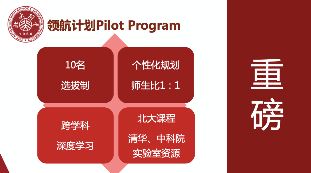 道爾頓學院背靠北大豐富的學術資源,為同學們提供了更優質的發展機會。其精心打造的“領航計劃”選拔10名學生進行重點個性化、一對一培養。參與領航計劃的同學們可以根據自己的興趣在北京大學14個學院超30門本科課程中進行選擇,真正體驗中國頂尖學府的學術魅力。