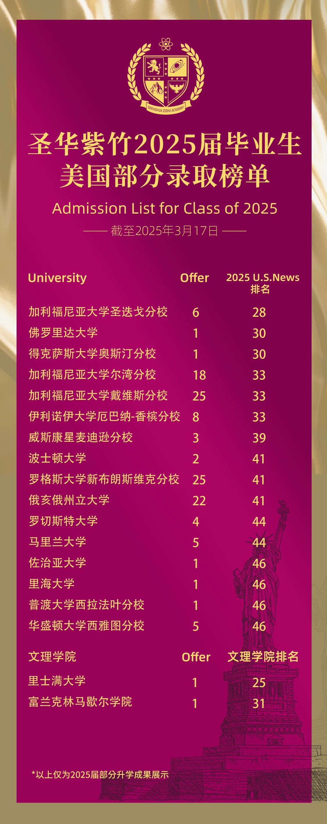 美國方向共收獲318封錄取通知書,其中來自U.S.News美國最佳大學排名前50的大學錄取128封(包括排名第28位的加利福尼亞大學圣迭戈分校6封,排名第30位的佛羅里達大學1封、得克薩斯大學奧斯汀分校1封,排名第33位的加利福尼亞大學爾灣分校18封、加利福尼亞大學戴維斯分校25封、伊利諾伊大學厄巴納-香檳分校8封,排名第39位的威斯康星大學麥迪遜分校3封,排名第41位的波士頓大學2封、羅格斯大學新布朗斯維克分校25封、俄亥俄州立大學22封,排名第44位的羅切斯特大學4封、馬里蘭大學5封,排名第46位的佐治亞大學1封、里海大學1封、普渡大學西拉法葉分校1封、華盛頓大學西雅圖分校5封),來自排名前40的文理大學錄取2封(包括排名第25位的里士滿大學1封、排名第31位的富蘭克林馬歇爾學院1封)。