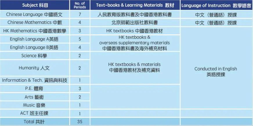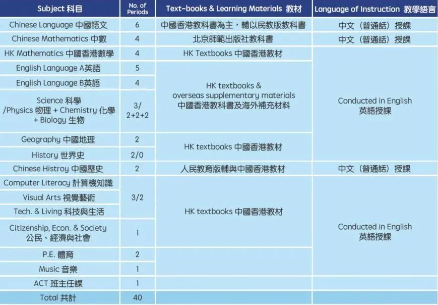 在高中階段,中國語文、公民與社會發展、中國歷史和中國文學是用中文授課和學習。英國語文和數學用英語授課。至于其余的DSE科目,學生可以根據自己的英語水平和職業規劃走向選擇用英語授課還是用中文授課的組別。學校鼓勵同學盡量使用英語學習,以擴大自己將來的升學出路。