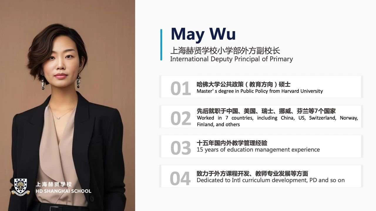 而在上海赫賢學校的吳成楠May Wu副校長(以下簡稱May)看來,中西教育優勢完全可以各取所長,經過這些年的課程研發和團隊融合,上海赫賢小學的外教團隊及英語教學已經形成了一套集科學性和系統性為一體的成熟模式,而她本人豐富的海外求學和工作經歷,恰恰在這當中扮演了一枚關鍵的角色。