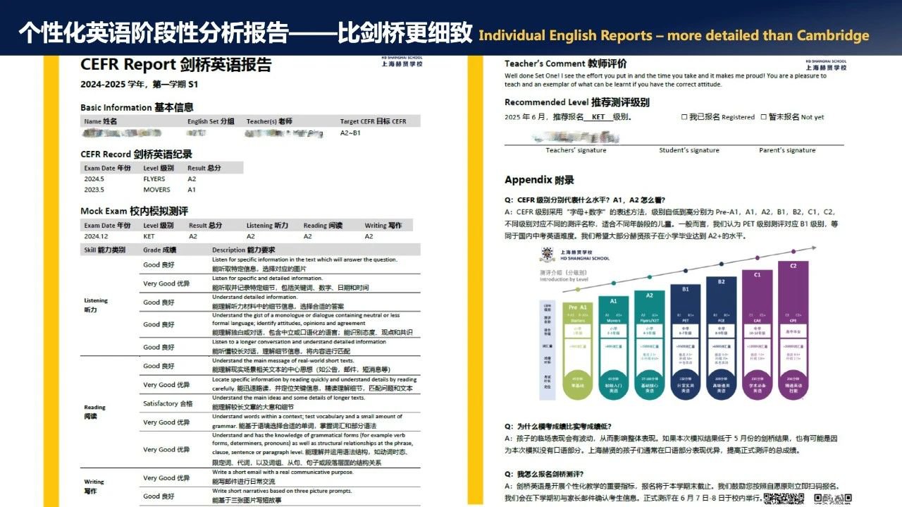 每學期末,赫賢小學的老師都會給每個孩子提供詳細的英文水平個性化報告,這份報告不僅涵蓋孩子的聽說讀寫能力,還會進一步細分為多個具體技能,如聽力分為五個不同技能,明確指出孩子在每個技能上的表現是優秀、良好、滿意還是低水平。