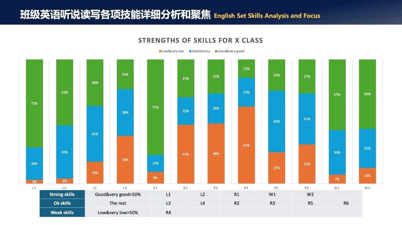 “此外,在班級層面,我們要求外教老師進行數據分析,通過 Excel 公式和分析方法生成班級整體英文學習情況的診斷報告。”