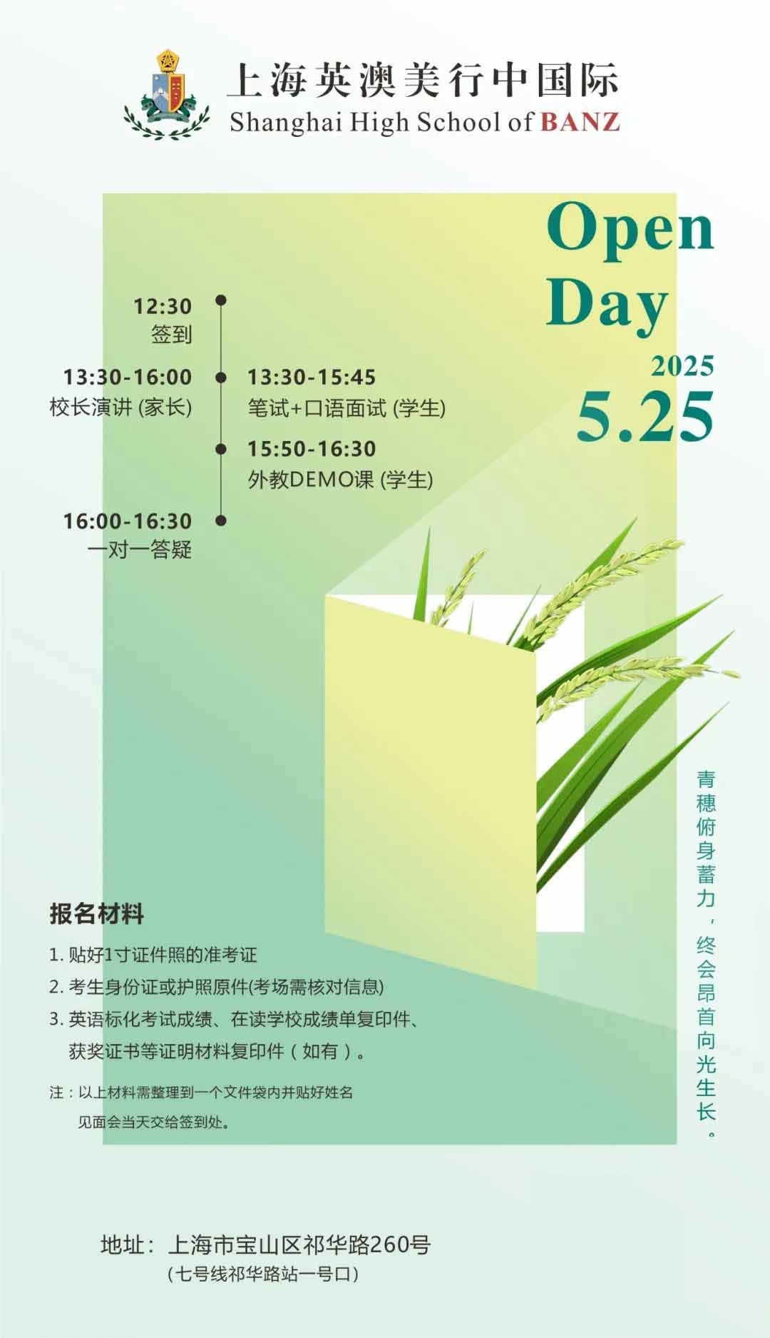 上海英澳美行中國際將于5月25日舉行校園開放日活動,在此誠摯地邀請您前來參加。