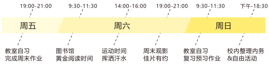 A: 周末留校同學,校內提供黃金十小時活動課程,學生會接受由學術類、活動類、體育健康類專職教師組織豐富的素質養成課程。