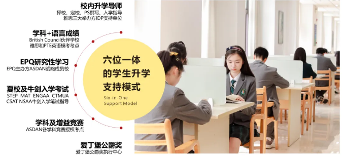 BANZ從每位學生進校起就建立了“六位一體”的學生升學支持模式,分別從學科+語言成績、EPQ研究型學習、愛丁堡公爵獎、牛劍入學考試、學科及增益競賽、升學校內顧問六個方向助力學生順利進入夢校。