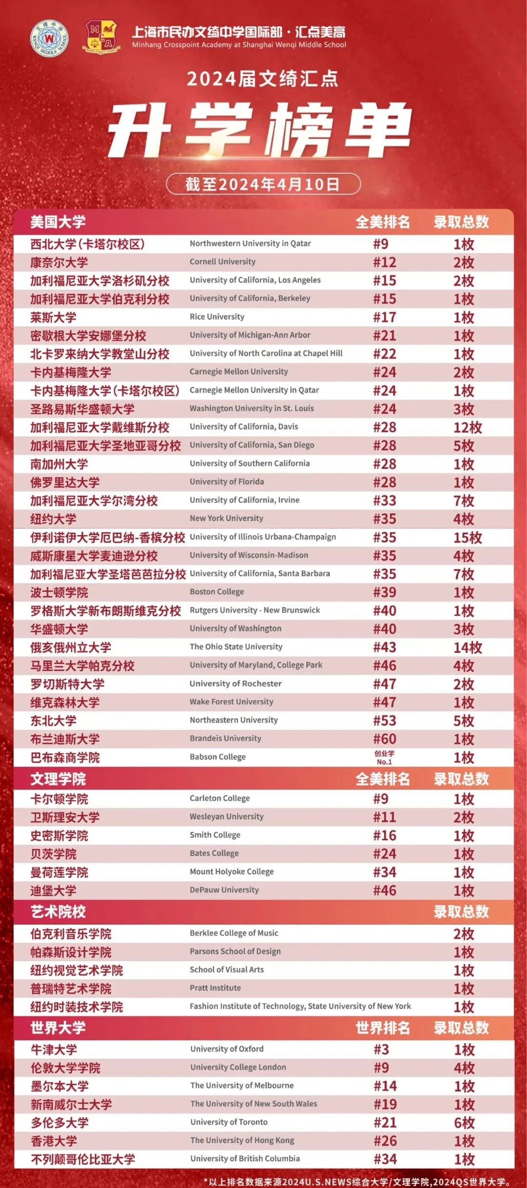 截止到4月10日,文綺匯點美高2024屆67位畢業生,共獲得來自全球6個國家和地區83所大學219份錄取。其中,美國大學錄取202份,英國錄取6份,加拿大錄取7份,澳大利亞錄取2份,中國香港錄取1份,中國澳門錄取1份。這其中,匯點er收獲綜合排名前30大學的比例為43%(參考2024U.S.NEWS排名和QS世界排名)。
