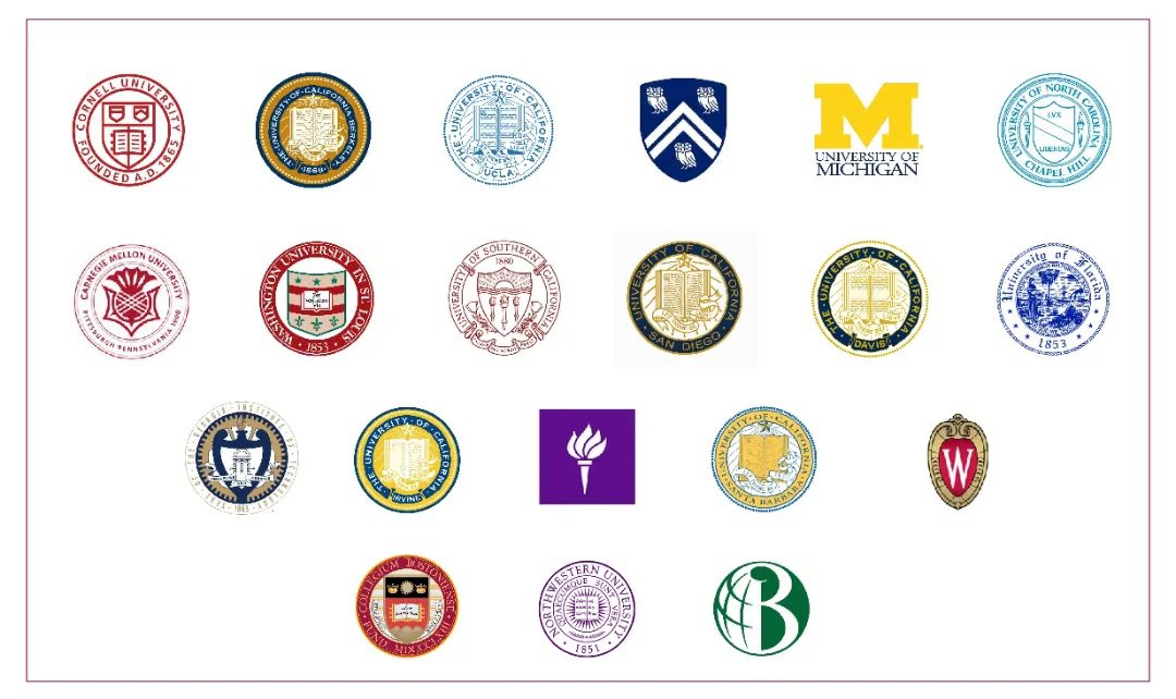 康奈爾大學、加利福尼亞大學伯克利分校、加利福尼亞大學洛杉磯分校、萊斯大學、密歇根大學安娜堡分校、北卡羅來納大學教堂山分校、卡內基梅隆大學、圣路易斯華盛頓大學、南加州大學、加利福尼亞大學圣地亞哥分校、加利福尼亞大學戴維斯分校、佛羅里達大學、佐治亞理工學院、加利福尼亞大學爾灣分校、紐約大學、加利福尼亞大學圣塔芭芭拉分校、威斯康星大學麥迪遜分校、波士頓學院、西北大學(卡塔爾)、巴布森商學院等
