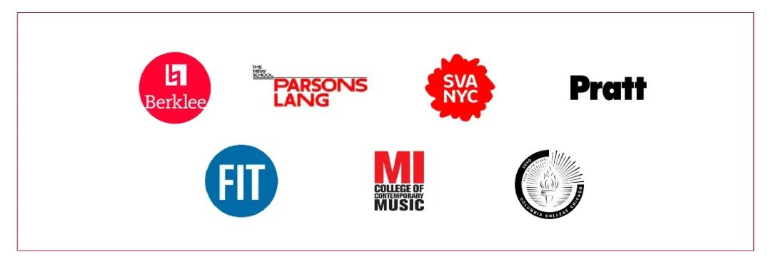 伯克利音樂學院、帕森斯設計學院、紐約視覺藝術學院、普瑞特藝術學院、紐約時裝技術學院、美國MI現代音樂學院、芝加哥哥倫比亞學院