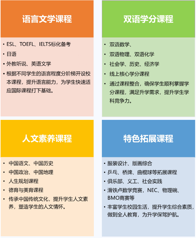 學校秉承“面向世界,面向未來,發現挖掘學生潛能,鼓勵發展個性特長;因材施教,有教無類,培養激發學習興趣,錘煉提升個人意志”的課程理念,從2011年起先后開設加拿大OSSD、美高AP、香港DSE和日本課程。在繼承中華優秀文化的基礎上,引進海外高中教育資源和體系,為中國學生量身定制融合國際課程,提供全方位的語言和學科教學,高中畢業后,90%學生可入讀英國前15,美國前80、加拿大前5、香港前8、澳洲前8、日本前50等世界知名大學。100%學生被國外正規四年制本科院校錄取。