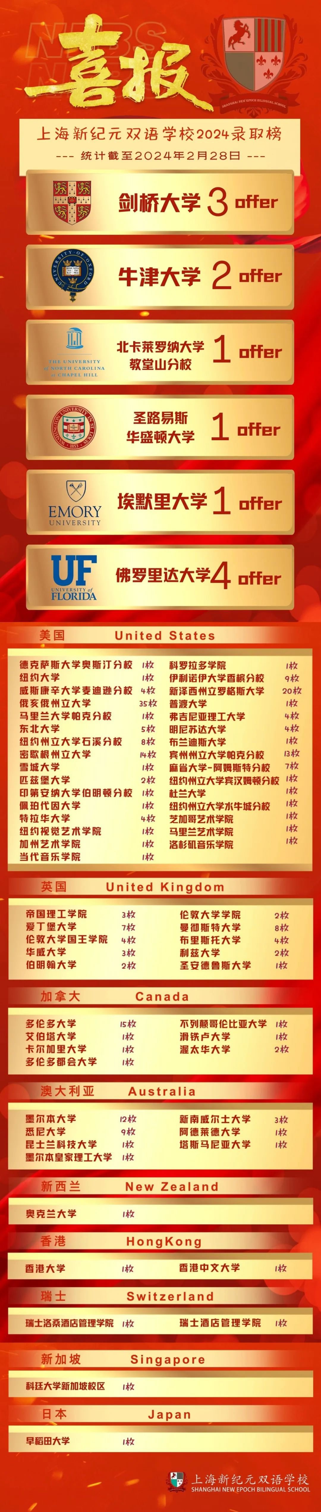截止至2024年2月28日,上海新紀元雙語學校2024錄取榜單如下: