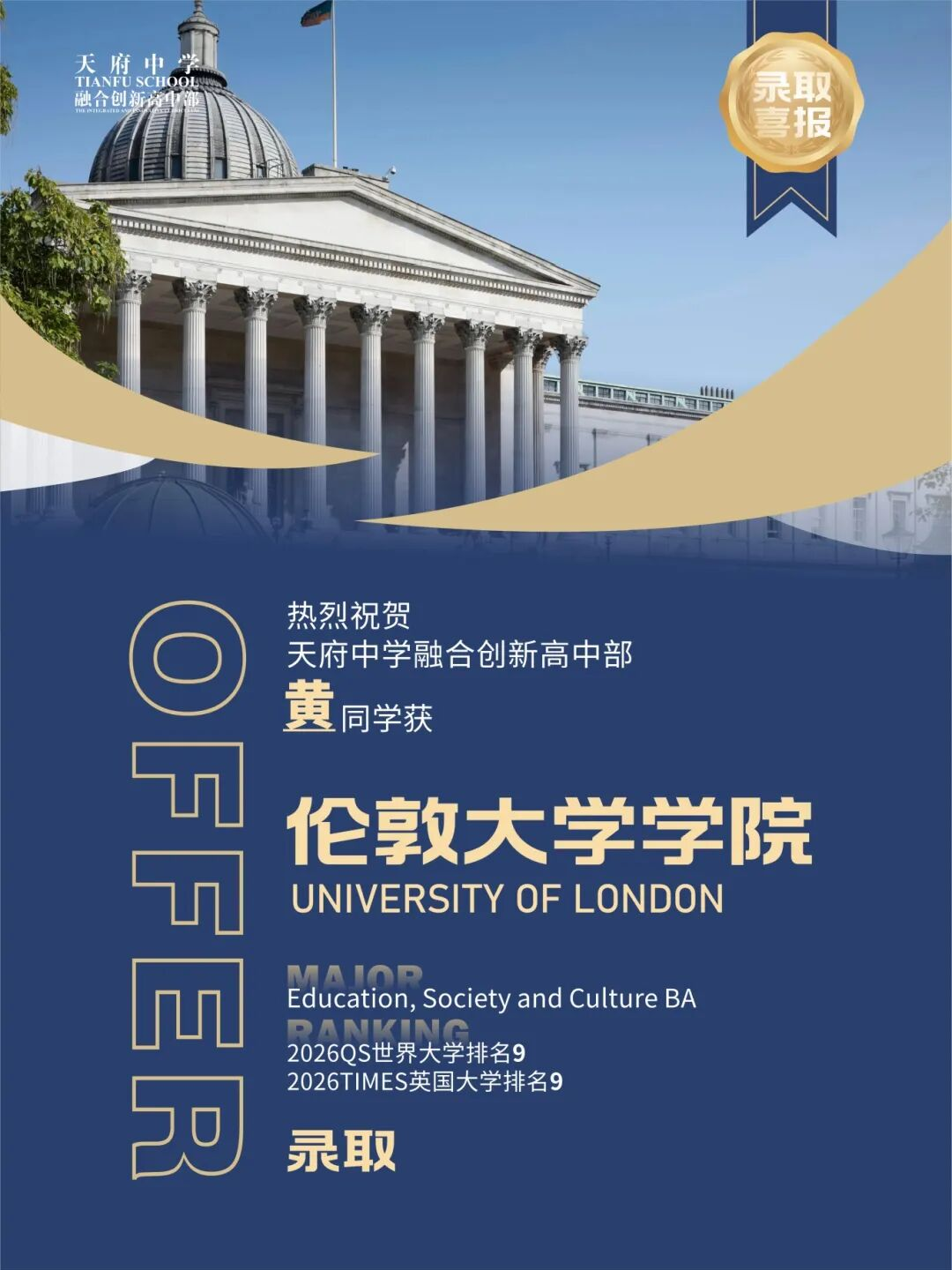 捷報(bào)再傳,星輝璀璨! 2026申請(qǐng)季佳音不斷,繼4份帝國(guó)理工學(xué)院面邀喜訊后,天府中學(xué)融合創(chuàng)新高中部今日再添一枚英國(guó)G5院校錄取熱烈祝賀黃同學(xué)斬獲倫敦大學(xué)學(xué)院(UCL)錄取! 黃同學(xué)所