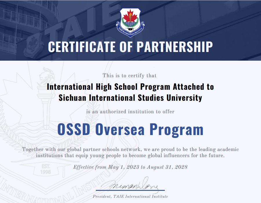 OSSD課程為加拿大安大略省文憑課程,就讀中加OSSD 3+0國際課程班的學生注冊加拿大達英國際學院OSSD學籍。學生完成10-11年級要求的加方學分課程后,12年級繼續在國內讀國際班,修讀加拿大12年級學分課程,達到安省的畢業要求后將獲得安省畢業文憑。