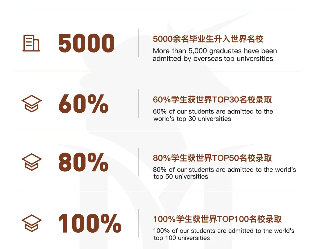 辦學25年,培養出近5000名優秀畢業生,均被世界TOP100的海外知名院校錄取,畢業生就讀于英國、美國、澳洲、加拿大、新加坡、德國、日本、中國香港等世界各地名校,培育出各個行業的精英人才遍布全球。