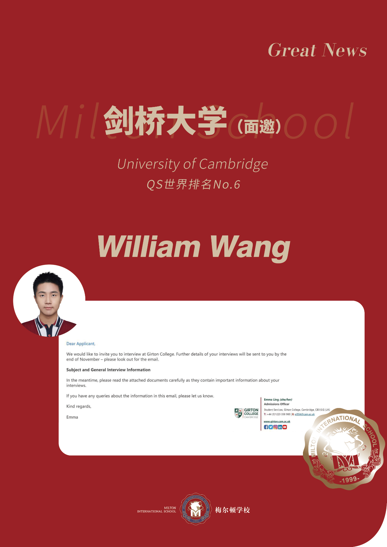 我們為William Wang同學感到無比自豪,并期待他在接下來的面試中繼續展現梅爾頓學子的風采,勇攀高峰,再創佳績!
