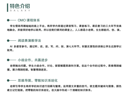 青島銀河學校積極探索課堂教學的新模式,為全面提高我校學生綜合素質能力,開闊學生眼界視野,讓學生在德、智、體、美、勞全面發展,充分發揮學生的主觀能動性。義務教育階段,在學習內容和形式方法上既保留了中國義務教育體系的精華,同時又吸收了外國教育的優勢,突出了英語的學習,使學生既有扎實的中國學科教育的基礎和基本功,又有國外教育體系培養的靈活、自信、創造能力,加以戲劇教學、禮儀實踐教學的學習,為學生未來的發展拓展空間,奠定基礎。