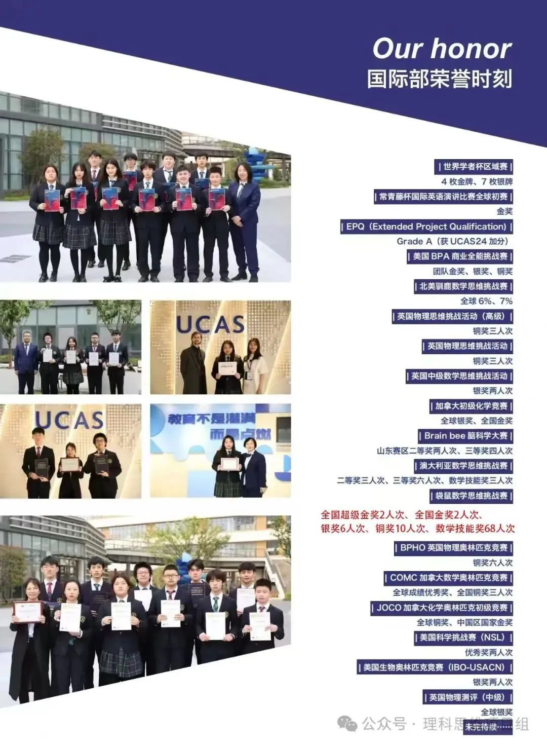自北京平移到青島辦學5年以來,成績斐然。校內專業的大學升學指導團隊已經成功為學生申請到英國、美國、加拿大、澳大利亞、新加坡、荷蘭、法國以及中國香港、澳門等多個國家及地區的世界名校,以A Level成績申請大學的學生100%收獲全球排名前50大學offer,初步實現了“低進高出、高進優出”的辦學目標,受到了學生、家長和社會的一致好評,已經成為青島中北部國際教育的新亮點。