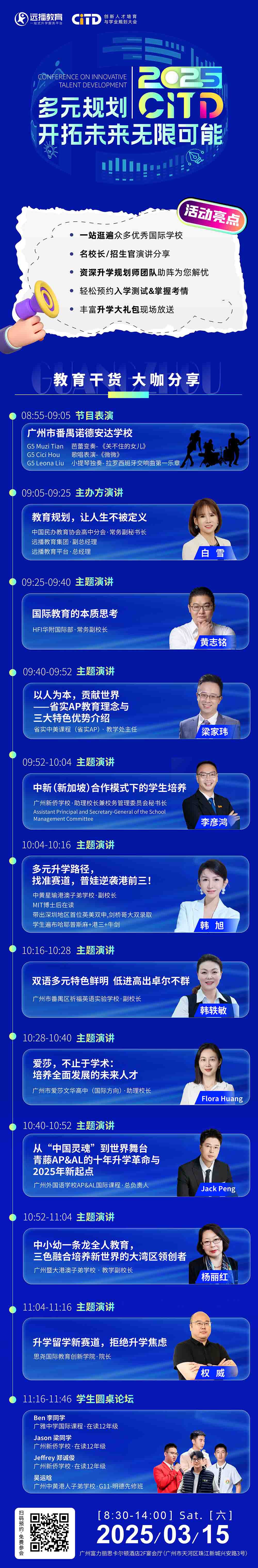 如果家長是初次接觸國際教育、國際化學校,不知道什么時候送孩子入讀合適?不了解國際化學校如何規劃孩子學習?或者具體如何選學校...這些困擾您的問題,遠播國際化人才培養與學業規劃大會將邀請國際化學校教育界大咖發表現場演講,深度剖析教育難點和痛點,解答您的教育困惑!