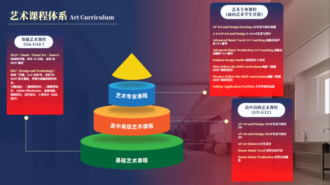 在課程設置上吸收IB課程等國際課程的核心優勢,在教學方式上實行跨學科融合,幫助每一位學生培養藝術素養與能力。幫助無論是對藝術感興趣或者將來致力于申請藝術專業的同學,提供了清晰而富有挑戰性的學習和發展成才路徑。