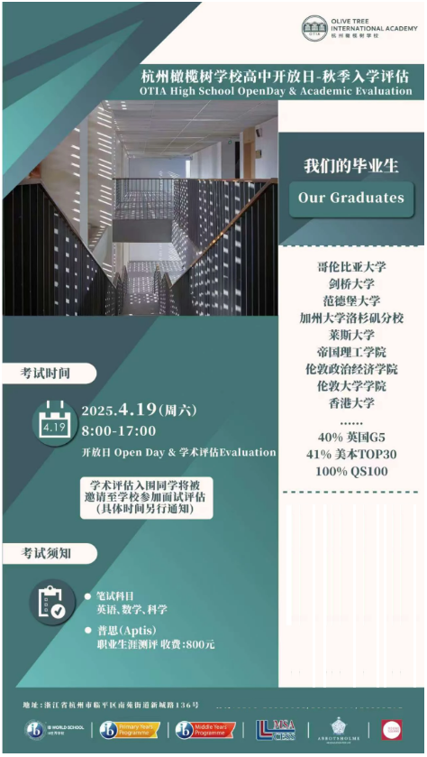 杭州橄欖樹國際高中 秋季入學評估開放日即將舉行。開放日將于...