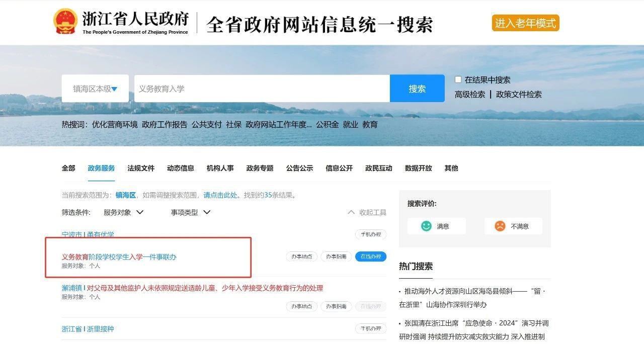 家長或法定監護人登錄浙江政務服務網檢索“義務教育階段學校學生入學一件事聯辦”(網址:http://nbzh.zjzwfw.gov.cn)進行入學報名。